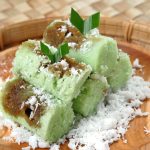 Serves: 6 Porsi Prep time: 15 Menit Cook time: 45 MenitBahan-Bahan260 gram Gula Merah (diiris sampai halus)100 gram Tepung Beras1/2 liter Santan cair10 buah Daun suji1/2 sendok teh Garam1 sendok teh Tepung Maizena (dilarutkan 2 sendok makan air)300 mililiter Santan kental4 lembar Daun Pandan200 mililiter Air5 biji Buah Nangka (diiris dadu)Secukupnya Takir Daun PisangInstruksiCuci daun pandan dan juga daun suji sampai bersih kemudian tumbuk sampai halus serta mengeluarkan air. Tambahkan 50 mililiter air kemudian aduk rata lalu saring dan juga sisihkan.Didihkan sisa air pada panci lalu masukkan potongan gula merah, masak sampai mendidih kemudian angkat dan saring, sisihkan.Siapkan panci berukuran sedang, tuangkan santan kental dilanjutkan dengan larutan maizena dan aduk-aduk sampai rata. Masak pakai api kecil sampai mendidih dan teksturnya mengental, sisihkan.Masukkan tepung beras pada panci lalu tambahkan santan encer dan aduk merata sampai tepung tercampur. Kemudian tuangkan air pandan suji dan juga garam dan aduk lagi. Masak pakai api kecil sampai adonan mendidih serta kental.Tuangkan adonan tepung pada takir sekitar 2/3 tinggi takir lalu tuangkan dua sendok teh gula merah cair dan satu sendok teh santan kental serta tambahkan irisan nangka.Susun takir dengan rapi pada kukusan yang sudah dipanaskan kemudian kukus dengan waktu 20 sampai 25 menit sampai kue matang.Kue lampu lampu asal Manado manis, gurih, dan wangi sudah jadi bisa disimpan dulu di kulkas sampai dingin sebelum disantap.